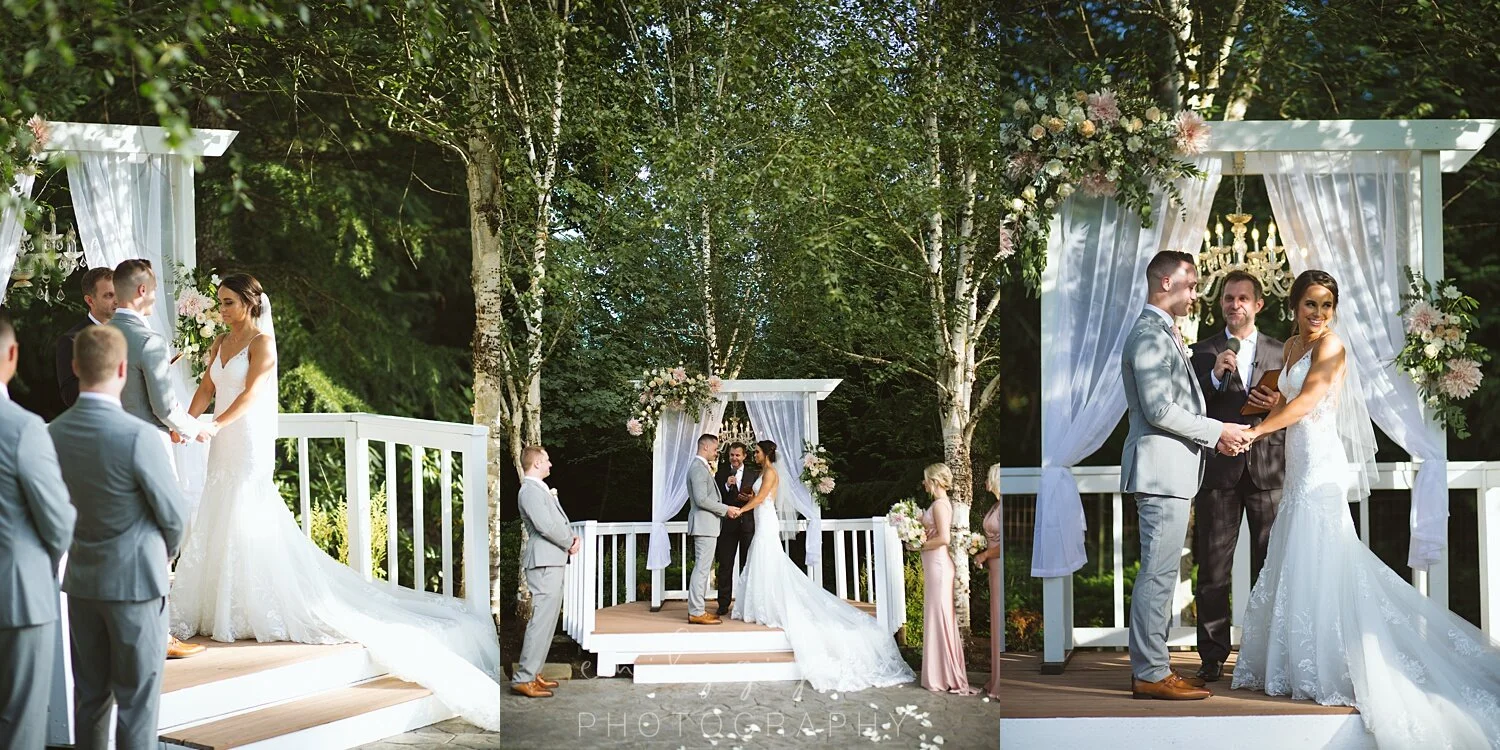 Now, for the venue!! I had never been to Creekside Estates in Washougal, Washington, before but I can definitely say that I love it! It is beautiful and green, has flowers, a little pond, and super cute getting ready areas (both for the guys and girls). The space is not too big, and not too small, and still has variety!! The ceremony was staged in a grassy area, looking out to a half gazebo and tall trees. The weather that day was super nice everything seemed to go so smoothly.